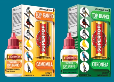 TOP-BANHO é um produto destinado à higiene e ao embelezamento de aves silvestres, ornamentais e exóticas de todas as idades, de pequeno, médio e grande portes. Desenvolvido com óleo natural de citronela, TOP-BANHO promove uma ação de limpeza e é um repelente natural, prevenindo e eliminando infestações parasitárias por piolhos, insetos, moscas, mosquitos e ácaros. Além disso, promove a maciez das penas, tornando-as mais sedosas